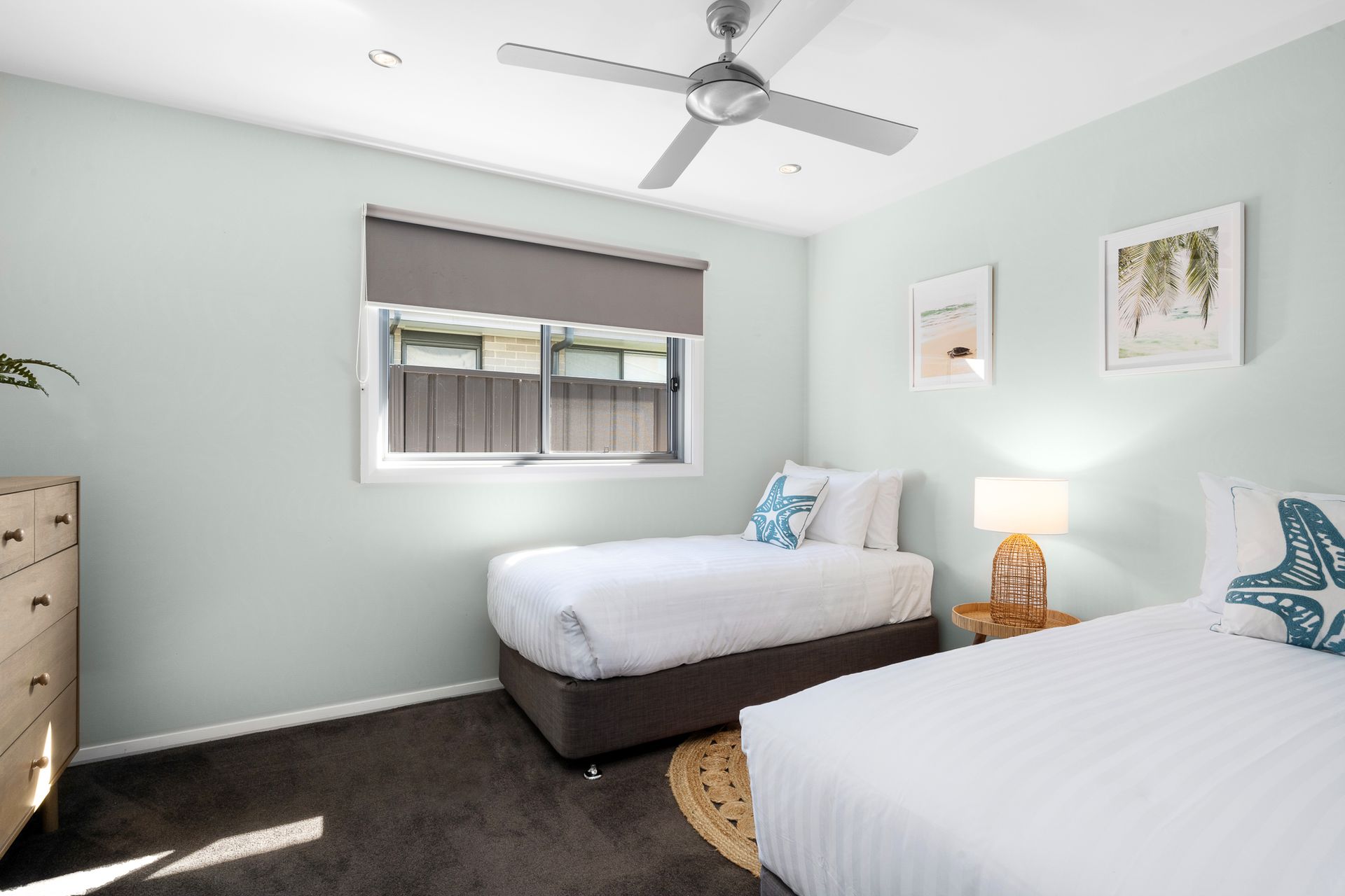 - Bed 2: Queen bed with ceiling fan and built-in wardrobe