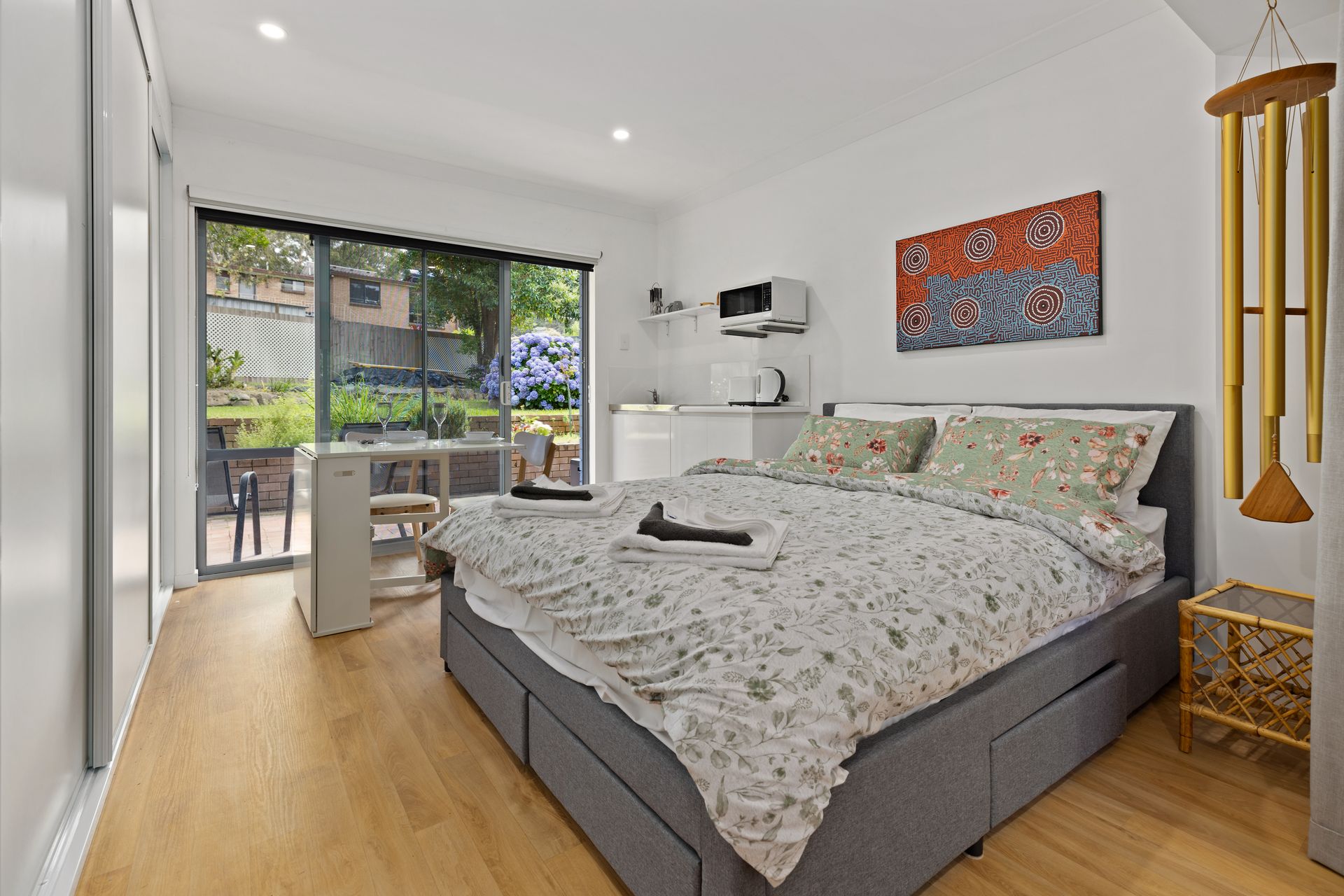 - Bed 2: Queen bed, reverse cycle air conditioning, built-in wardrobe, kitchenette, lounge area, French doors