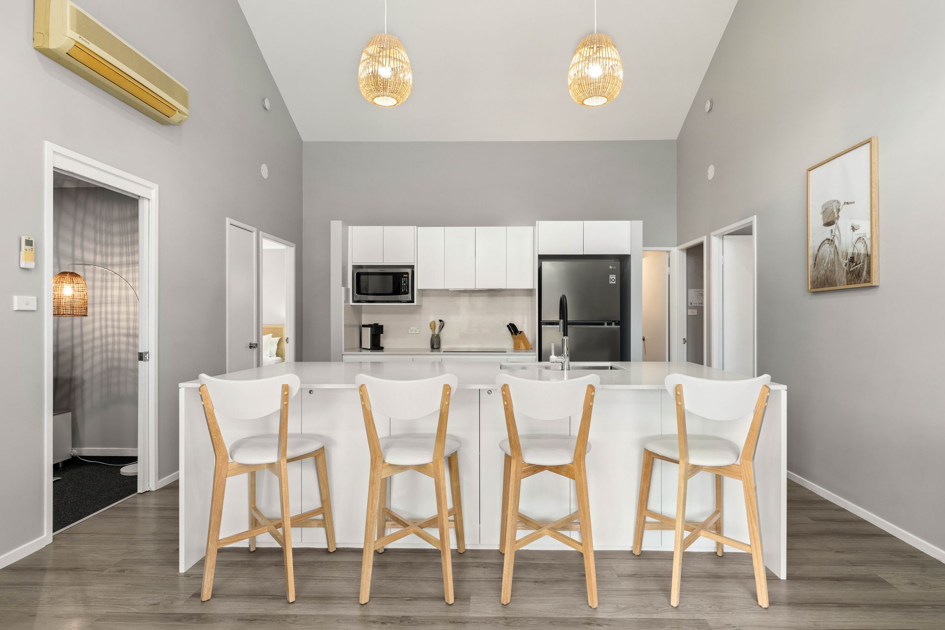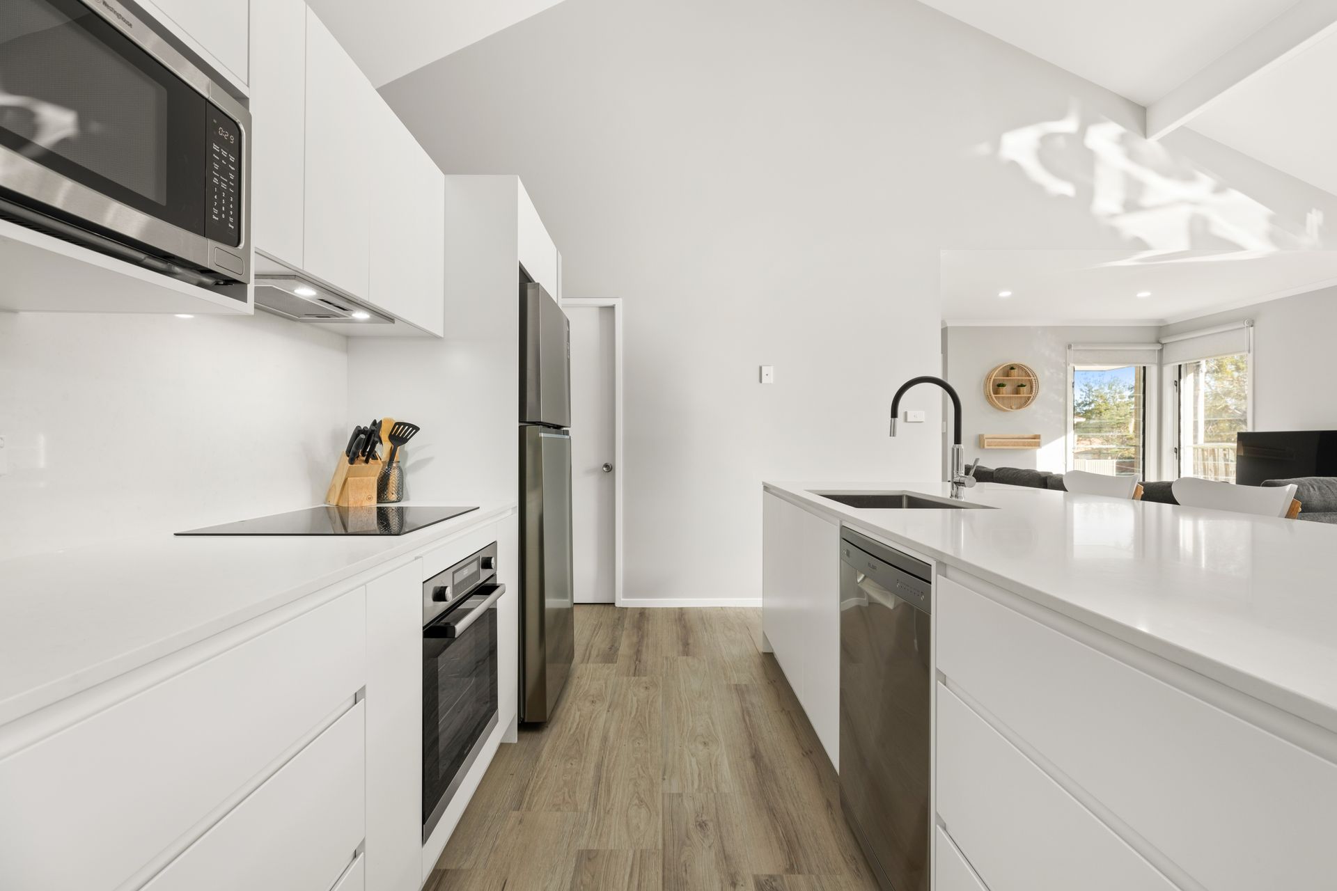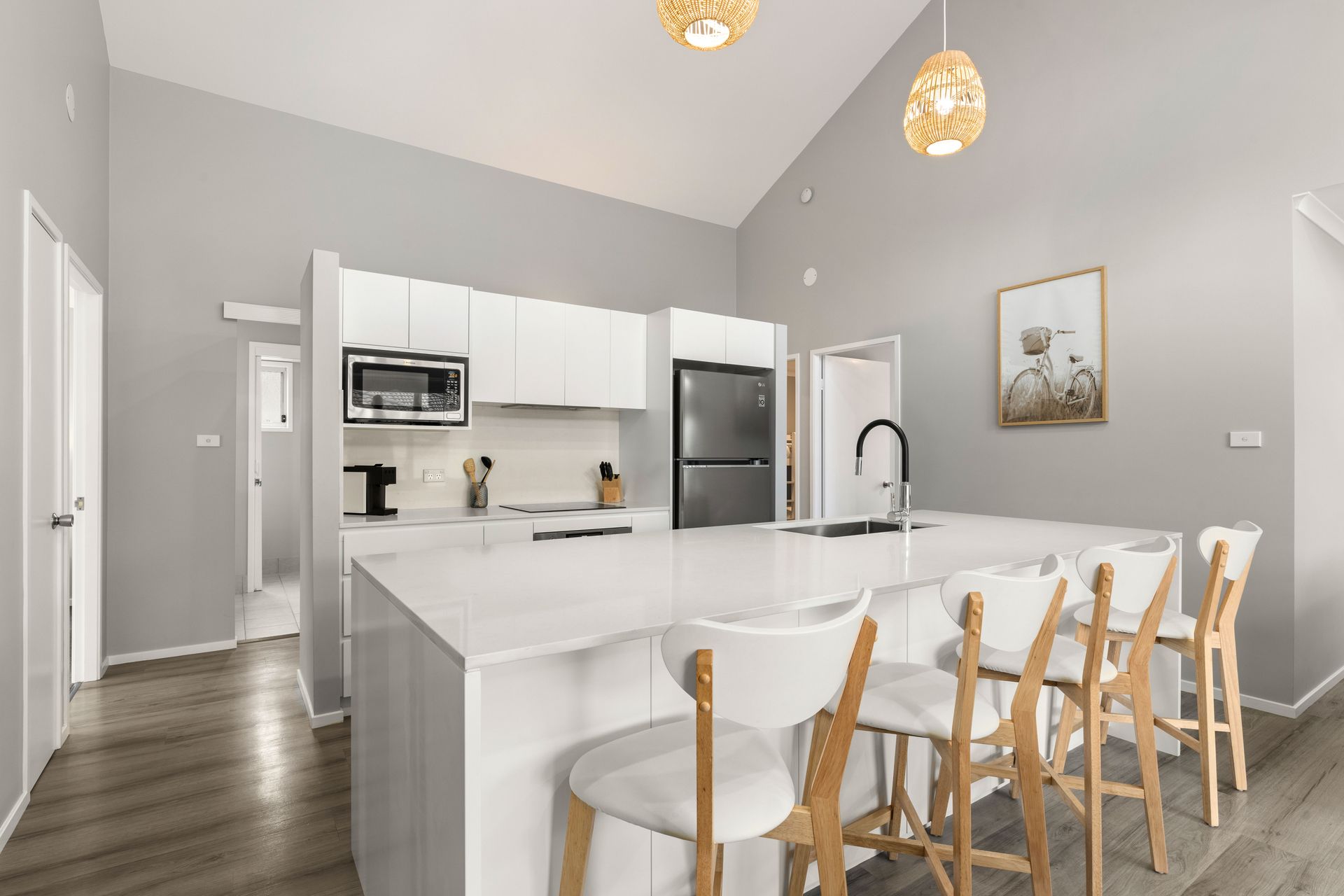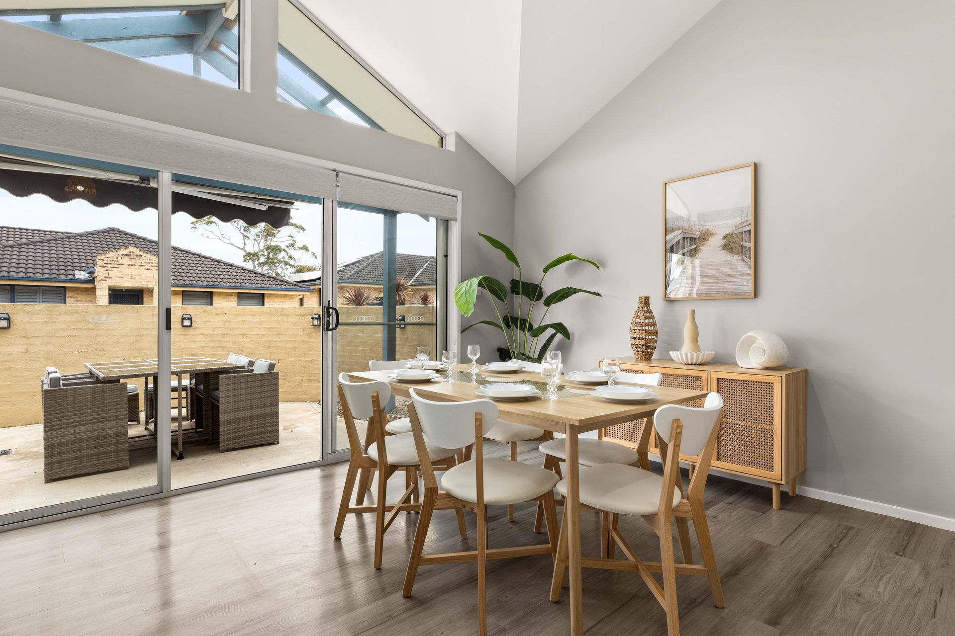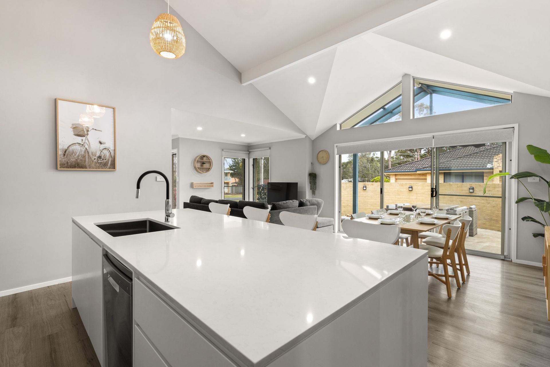 Your perfect beach getaway! This spacious retreat features a large open-plan living, dining, and modern kitchen area with elegant vaulted ceilings, bathing the space in natural light.