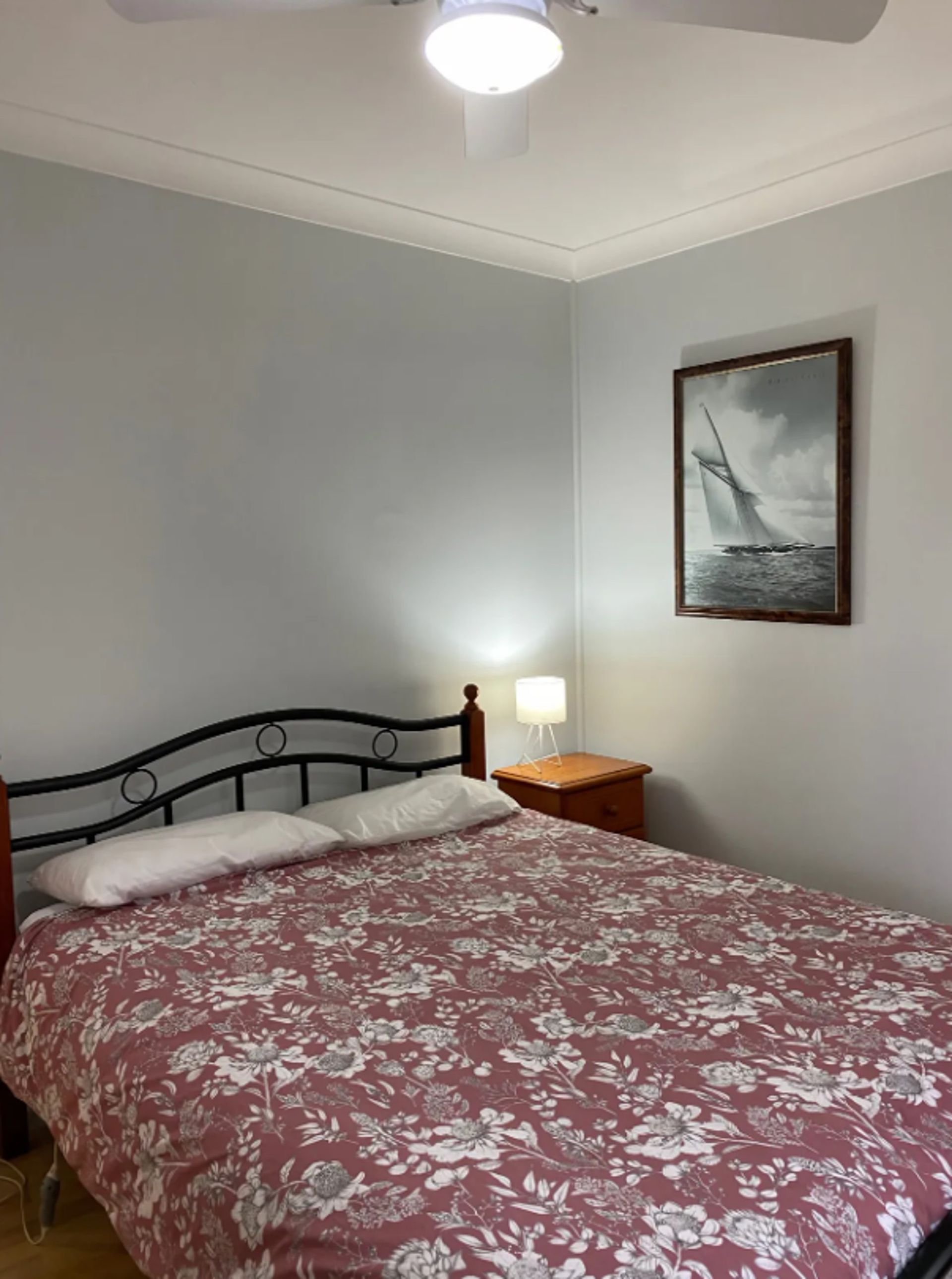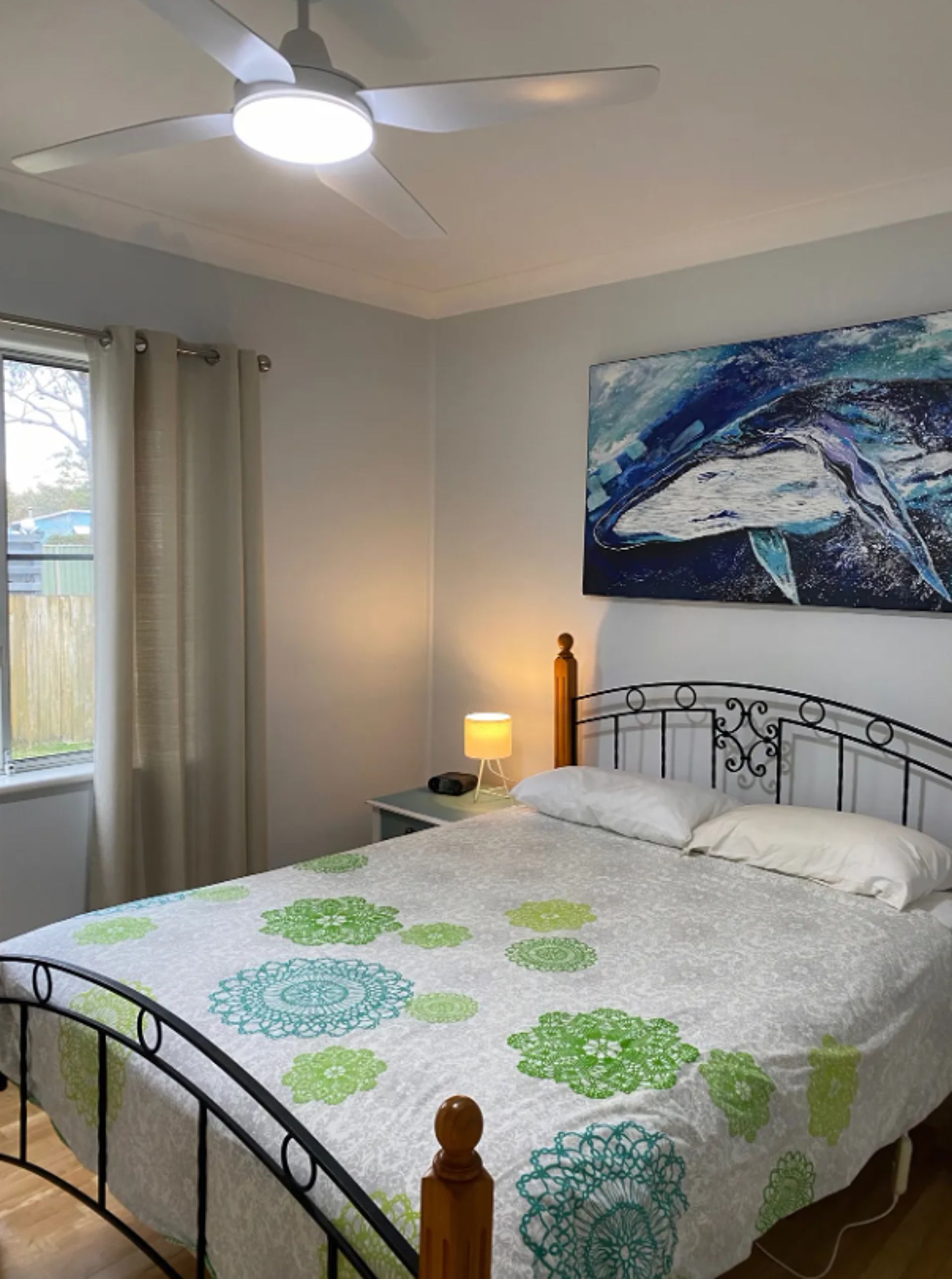 - Bed 1: Queen bed with ceiling fan and built-in wardrobe