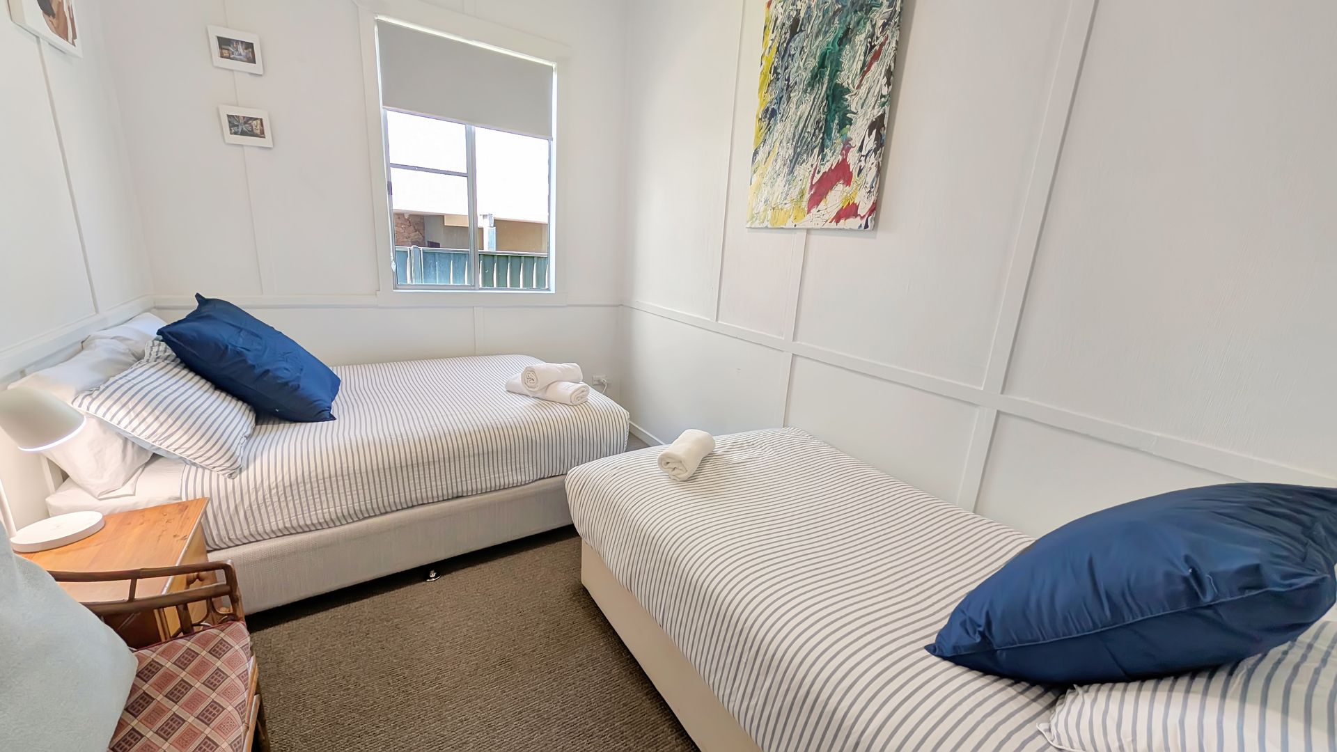 - Bed 1: Queen bed, with built in wardrobe, ceiling fan and portable heater