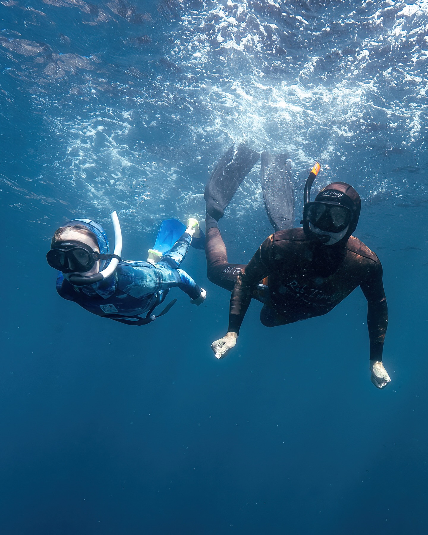 The Fins: Long freediving fins (like those in our image) are a must for fighting currents and deep descents.